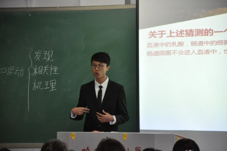 最后,2020级临床药学的孙浩轩同学为大家讲述了肠道菌群与运动力的联系,完整的实验设计、详实的实验数据、深入浅出的讲解,让大家理解了肠道菌群是如何在运动过程中发挥神奇作用的,他独特的讲课视角、新颖的授课方式、轻松的课堂互动,俨然一个青年学者在为大家解读专业的最新进展。