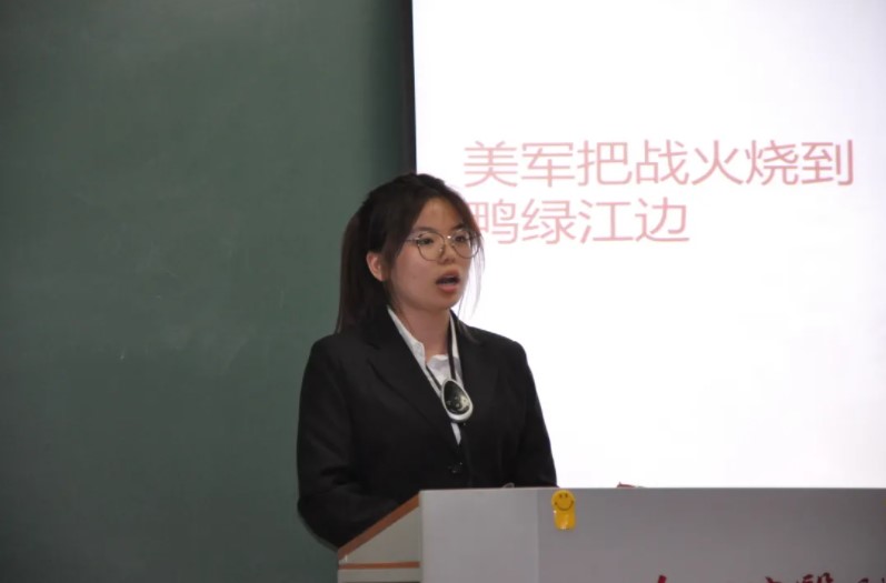 随后上场的是2020级药学的屈雯雯同学,她以“抗美援朝战争”为题,以“为什么抗美援朝”到“战役怎么打”、以及“抗美援朝精神给我们的启示”为主线,用一幅幅珍贵的照片和影音资料讲述着——舍身炸碉堡的黄继光、烈火中永生的邱少云、还有视死如归的冰雕连战士,英雄们坚韧不屈的爱国精神和为国捐躯的伟大牺牲精神,强烈震撼和感染每一个人,激发出同学们强烈的爱国情怀。