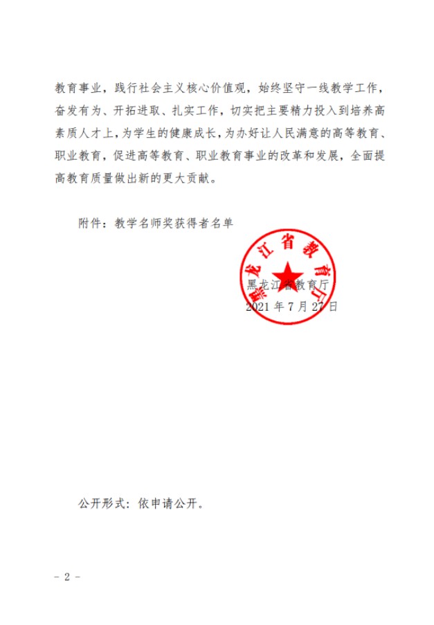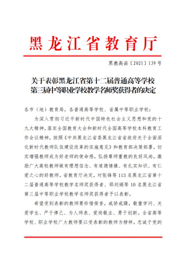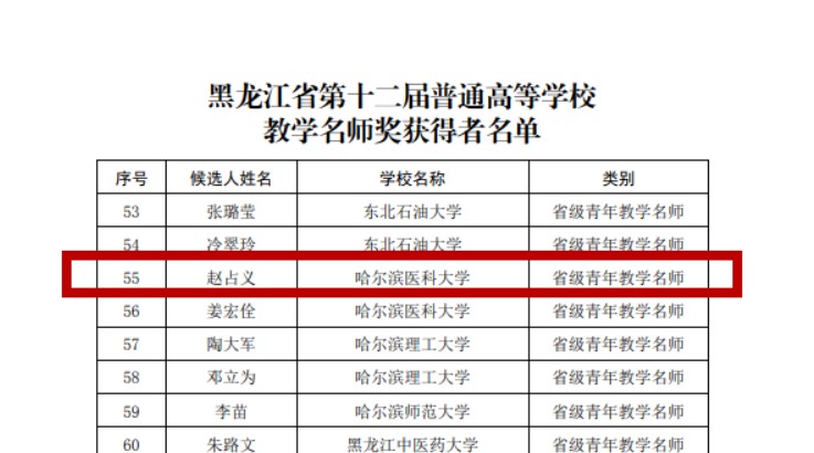 近日,黑龙江省教育厅发布《关于表彰黑龙江省第十二届普通高等学校第三届中等职业学校教学名师奖获得者的决定》(黑教高函〔2021〕139 号)文件,我院赵占义副教授获黑龙江省第十二届普通高等学校青年教学名师奖。
