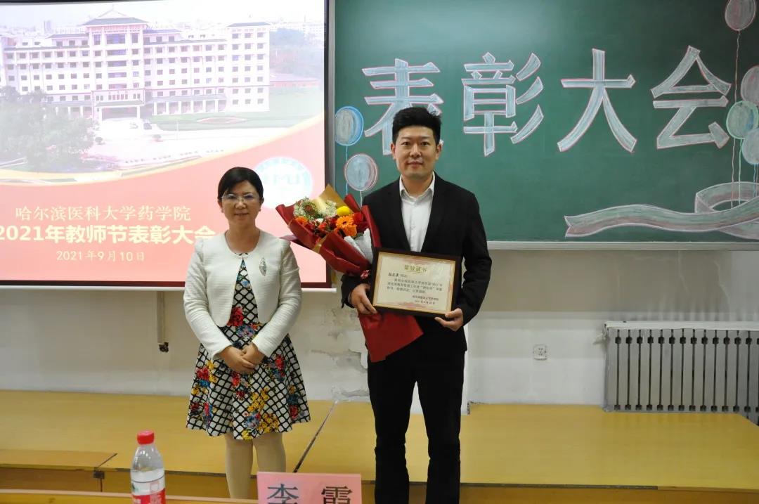 表彰大会在铿锵激昂的国歌声中拉开序幕,张勇院长首先向全院默默耕耘、无私奉献、恪尽职守的每一位老师表示最崇高的敬意。谢良军副院长、白云龙副院长以及潘振伟副院长分别宣读了《药学院关于授予教书育人先进个人“园丁奖”的决定》、《药学院关于授予优秀教育管理工作者“耕耘奖”的决定》以及《药学院关于授予优秀科技工作者“丁香奖”的决定》,其中吴延丽副教授、王英骥副教授荣获“园丁奖”;梁海海教授荣获“丁香奖”;陈东苏老师荣获“耕耘奖”荣誉称号。这些获奖教师长期以来在工作岗位上兢兢业业、辛苦付出,用实际行动践行药学教育工作者的使命与担当,春风化雨,呕心沥血,是全体师生学习的榜样。孙建平书记、张勇院长以及李霞副书记分别为获奖教师颁奖,全场响起热烈掌声对他们表示祝贺。