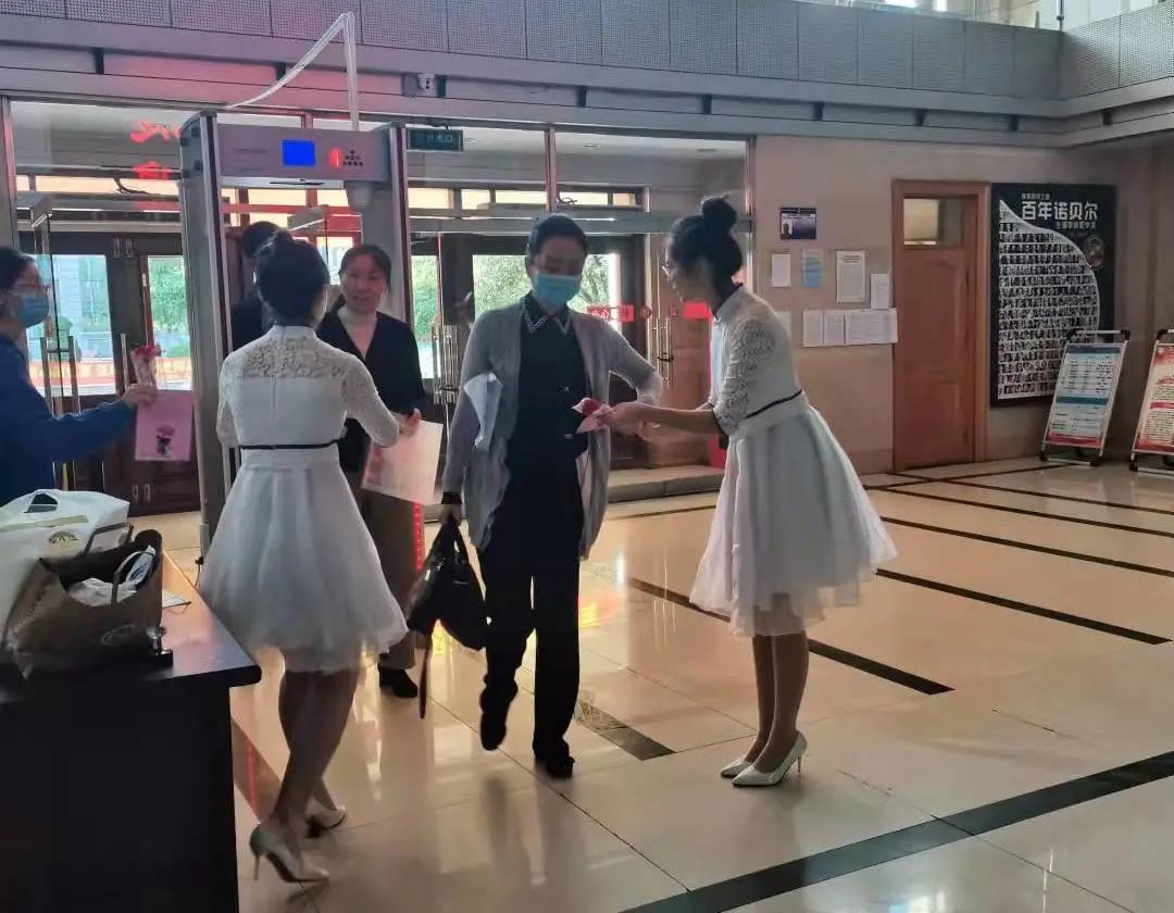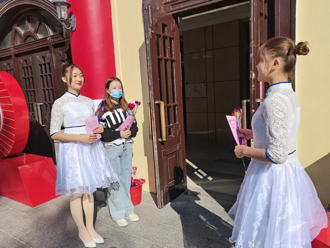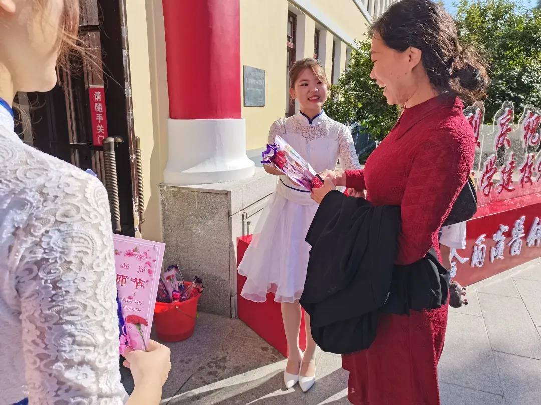 一大清早,学生年级本科生代表就精心准备了美丽的康乃馨和节日贺卡,在学校主楼和药学院门前为全体老师们献上了节日的第一份祝福。