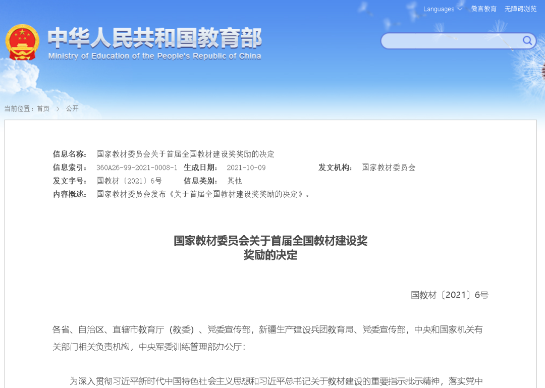 为深入贯彻习近平新时代中国特色社会主义思想和习近平总书记关于教材建设的重要指示批示精神,落实党中央、国务院关于实施教材建设国家奖励制度的决策部署,国家教材委员会组织开展了首届全国教材建设奖评选工作。根据《国家教材委员会关于开展首届全国教材建设奖评选工作的通知》(国教材〔2020〕4号)要求,经评审委员会评审、评选工作领导小组审定、国家教材委员会批准,决定授予义务教育三科统编教材等10种教材“全国优秀教材特等奖”,授予200种教材“全国优秀教材一等奖”,授予789种教材“全国优秀教材二等奖”,授予99个集体“全国教材建设先进集体”称号,授予200名同志“全国教材建设先进个人”称号。
