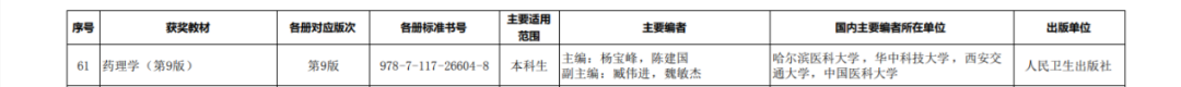 10月12日,教育部公布《国家教材委员会关于首届全国教材建设奖奖励的决定》,由杨宝峰院士、陈建国教授主编的《药理学》(第9版,人民卫生出版社)荣获全国优秀教材(高等教育类)一等奖,杨宝峰院士获全国教材建设先进个人荣誉称号。