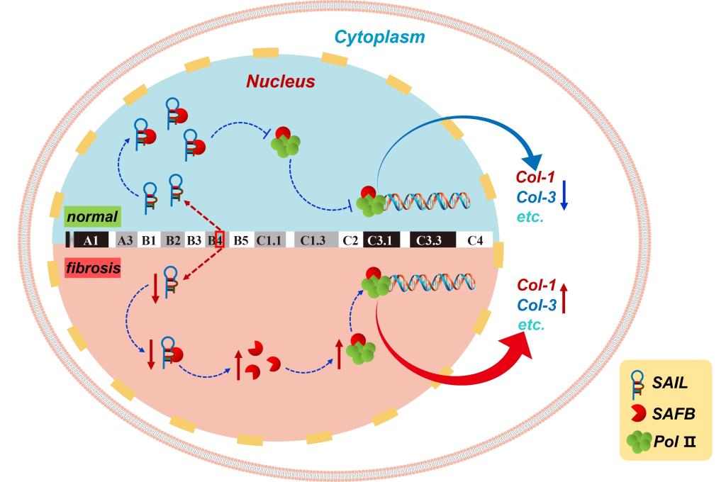 该研究深入揭示了长链非编码RNA(lncRNA)在心肌纤维化中的调控作用及机制,发现lncRNA-SAIL是心肌纤维化病理过程中的一个关键调控分子。课题组通过整体动物及细胞实验证实,SAIL在心肌纤维化中表达显著降低,敲减SAIL可诱发或加重心肌纤维化,而增加SAIL的表达则可抑制心肌间质胶原沉积,改善心脏重构,具有显著的抗心肌纤维化作用。SAIL抗心肌纤维化的机制主要是通过与核基质结合因子SAFB结合,阻碍SAFB与RNA聚合酶Ⅱ之间的相互作用,进而抑制促纤维化基因的表达。进一步研究发现,SAIL是一个高度保守的lncRNA,值得关注的是序列的保守片段具有全长序列的抗心肌纤维化功能;在人源心肌成纤维细胞也具有显著的抗纤维化作用。