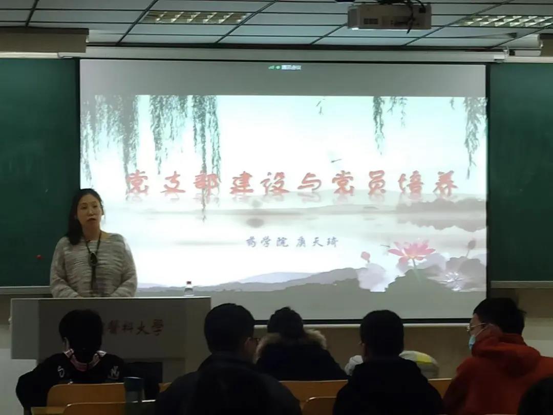 药学院党委副书记李霞教授和学生年级庚天琦老师分别以《党员作风建设与自我成长》和《党支部建设与党员培养》为题开展专题讲座,培训还组织学生集体观看朴林教授和高原丽教授讲解的《深入把握习近平新时代中国特色社会主义思想》、《培育和践行社会主义核心价值观》的讲座视频。李霞教授分别从作风的含义与发展、加强作风