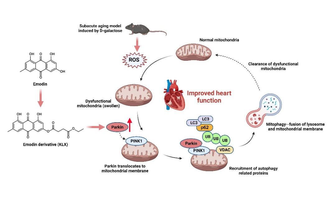 心脏衰老是多种慢性心血管疾病的主要诱因,已成为威胁老年人生命和生存质量的突出问题,由于对衰老心脏退行性结构和功能变化认识不清,目前仍缺少有效干预措施。杨宝峰院士团队研究发现大黄素衍生物(康乐欣)及大黄素可显著改善D-半乳糖诱导的衰老小鼠心脏舒张功能障碍和组织结构异常,减轻心肌细胞衰老。进一步研究发现,康乐欣及大黄素靶向结合于线粒体自噬相关蛋白Parkin的UBL结构域,提高其蛋白质稳定性,促进Parkin转位至线粒体膜上,进而激活线粒体自噬,清除受损线粒体。由于与Parkin蛋白的结合力不同,康乐欣抗衰老的效果优于大黄素。康乐欣及大黄素可作为预防和治疗心脏衰老的具有临床前景的候选药物。