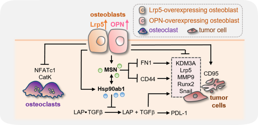 在成骨细胞中过表达Lrp5或OPN可使其条件培养基具备肿瘤抑制及骨保护的作用。培养基中MSN及Hsp90ab1的表达量增加,下调了使组蛋白去甲基化的KDM3A,以及抑制免疫反应的 PDL1。与此同时还下调了肿瘤促进基因Lrp5、MMP9、Runx2及Snail