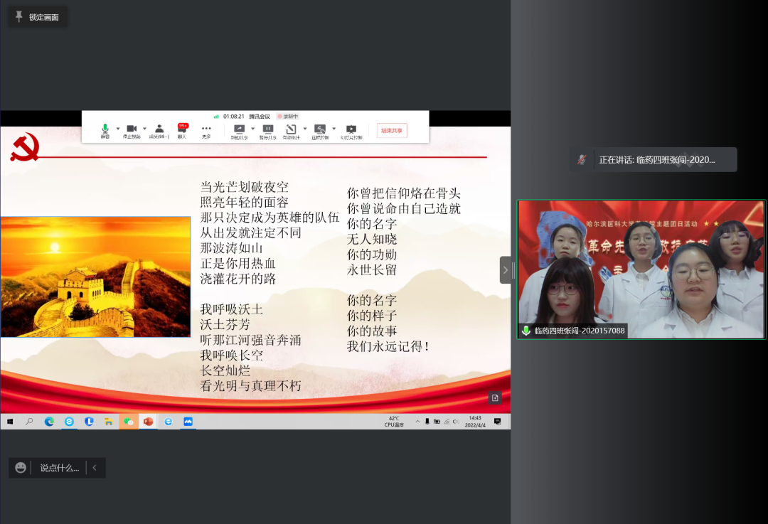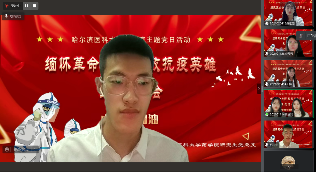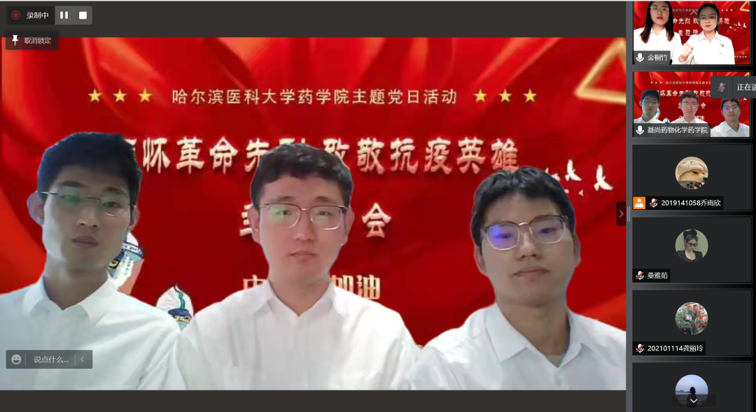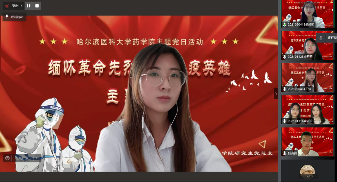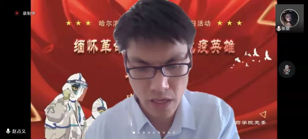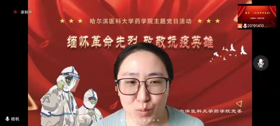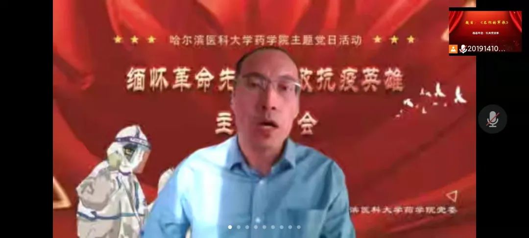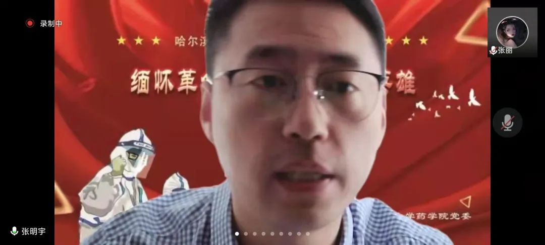 又是一年春草绿,梨花风起清明时。为弘扬英烈精神,赓续红色血脉,引导广大师生深切追忆革命英烈的光辉事迹,弘扬爱国主义、民族精神和抗疫精神,在缅怀英烈中叩问初心使命,在传承精神中坚定理想信念,4月4日下午,药学院党委举办“缅怀革命先烈、致敬抗疫英雄”主题诗会暨特色党团日活动,通过诗朗诵、歌曲等文艺载体,以云端宣传的方式,向英雄们赤胆忠肝的报国之心、鞠躬尽瘁的为民情怀和大爱无疆的抗疫精神致以最崇高的献礼。本次活动分三场进行,面向教师党员、研究生党员、本科生党团员陆续展开,师生党团员代表共计500余人参与其中,共同感受英雄的无畏与荣光。