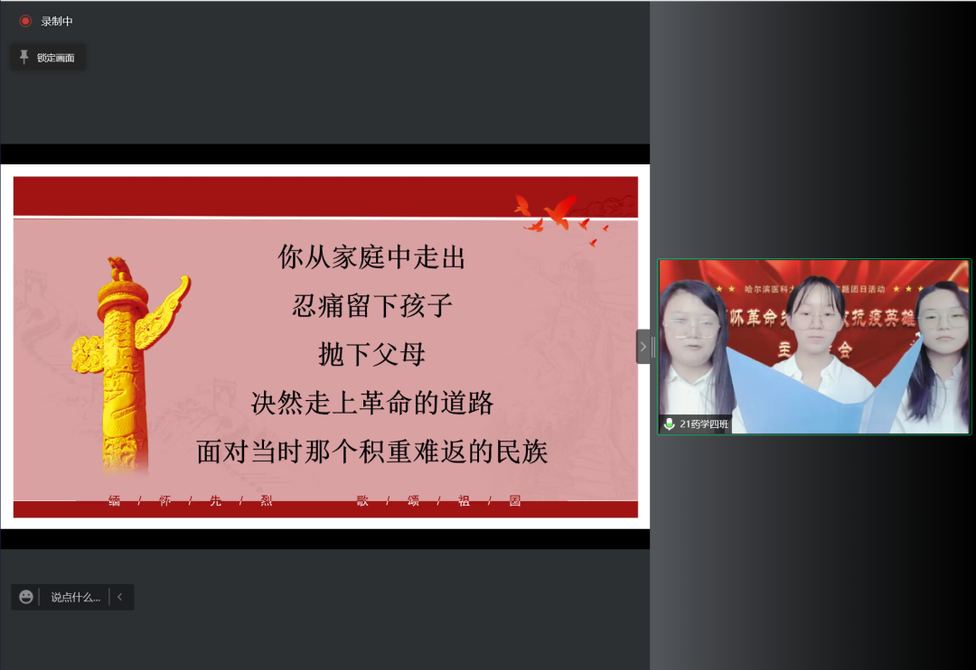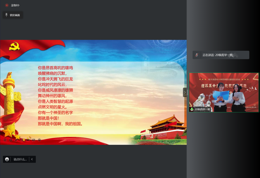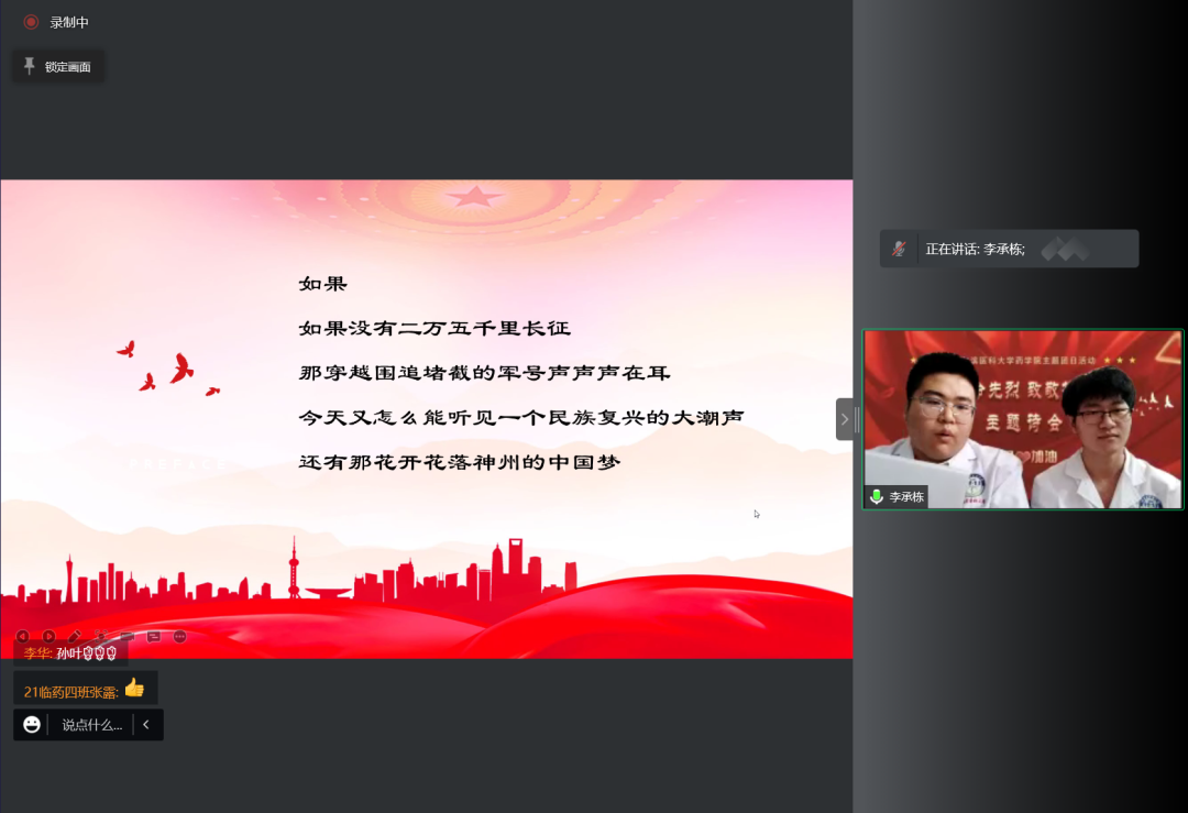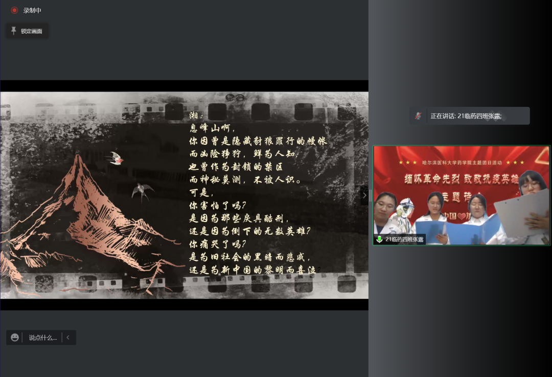 在本科生主题诗会中,2020级临药杨男同学的一首《错位时空》独唱触动心弦,带领同学们共同感受峥嵘往事,追忆英雄事迹。随后,8支经过初赛遴选出的朗诵队伍依序进行了表演。大家从中感受着先烈们为实现理想而视死如归的英雄气概,感受着为保持操守从容就义的高尚情怀;感受着默默无闻的凡人身躯白衣执甲、逆风而行,在疫情席卷肆虐的日子里为全国人民健康铸就铜墙铁壁的勿忘我精神;也感受着百年英雄为国捐躯,新时代青年当独立自主,奋发图强,振兴中华的无比热盼和决心。