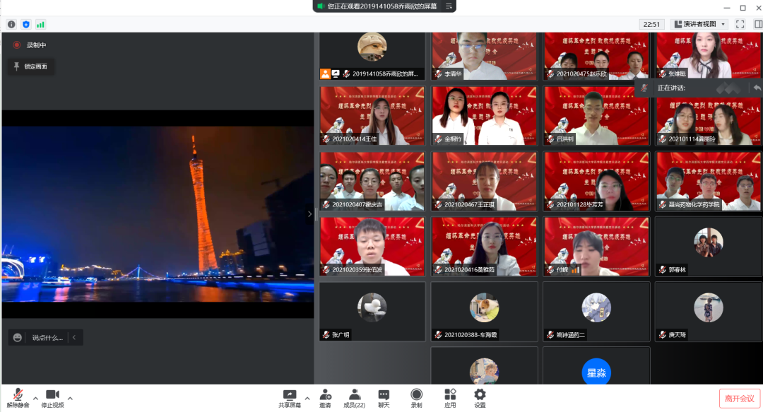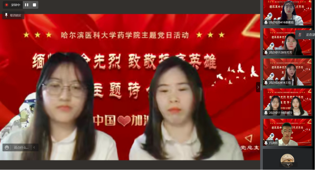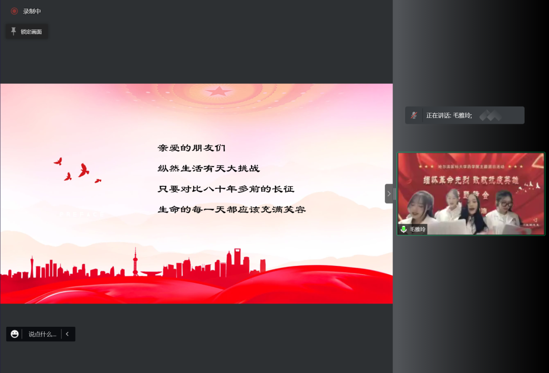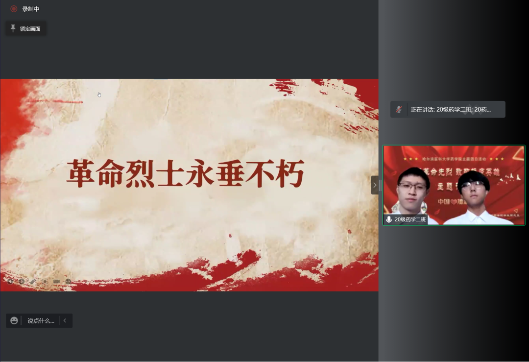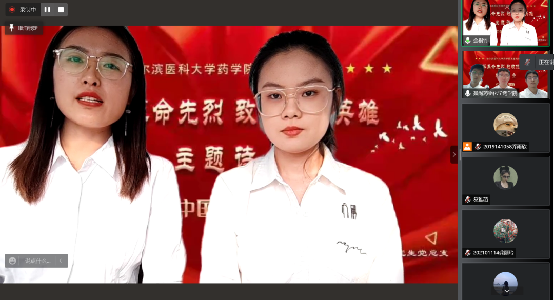 在本科生主题诗会中,2020级临药杨男同学的一首《错位时空》独唱触动心弦,带领同学们共同感受峥嵘往事,追忆英雄事迹。随后,8支经过初赛遴选出的朗诵队伍依序进行了表演。大家从中感受着先烈们为实现理想而视死如归的英雄气概,感受着为保持操守从容就义的高尚情怀;感受着默默无闻的凡人身躯白衣执甲、逆风而行,在疫情席卷肆虐的日子里为全国人民健康铸就铜墙铁壁的勿忘我精神;也感受着百年英雄为国捐躯,新时代青年当独立自主,奋发图强,振兴中华的无比热盼和决心。