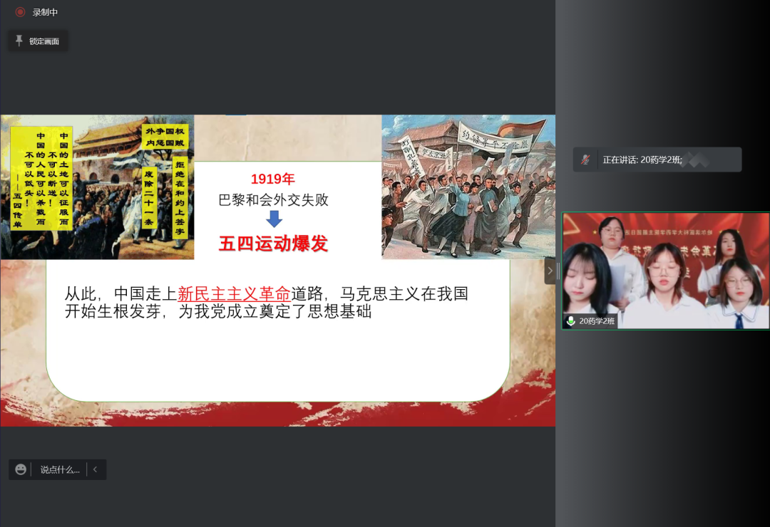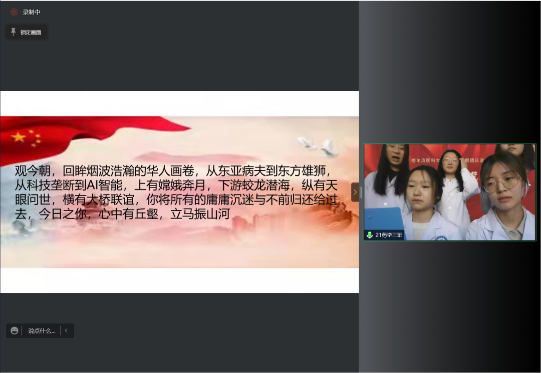 三场活动的最后,全体师生打开摄像头,用最真挚的情感齐声合唱《我和我的祖国》,将主题诗会活动气氛推向高潮。