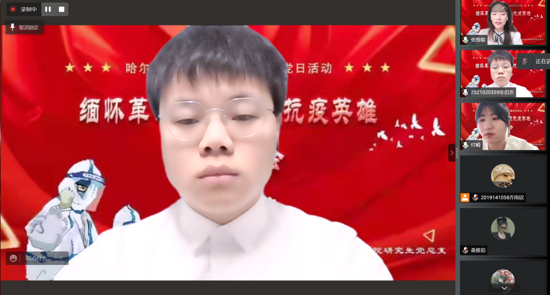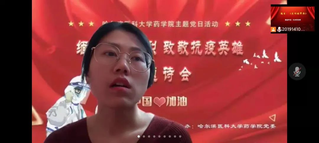 研究生主题诗会中,研究生党员代表也精心准备了5个诗朗诵节目,纷纷表达了对祖国的热爱、对革命先烈的敬佩与哀思,表达了对疫情期间冲在前线的抗疫英雄们的崇高致敬,学习他们的无私奉献、英勇奋斗的大无畏精神。