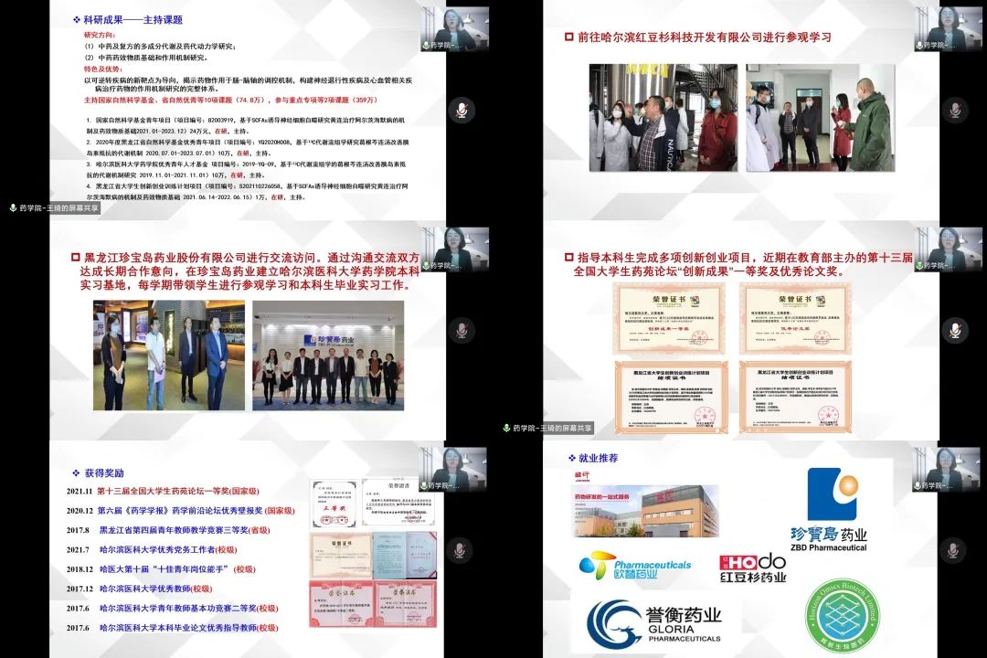 (1) 前往昭衍新药(苏州)进行哈尔滨医科大学药学院毕业生推介工作。使昭衍新药(苏州)人力资源进一步了解药学院学生的培养方式及学生获奖和发表文章情况,双方已达成长期合作共识,在昭衍新药建立哈尔滨医科大学药学院本科实习基地,每年派送一部分本科生进行毕业实习。同日进行昭衍新药哈尔滨医科大学药学院宣讲会。