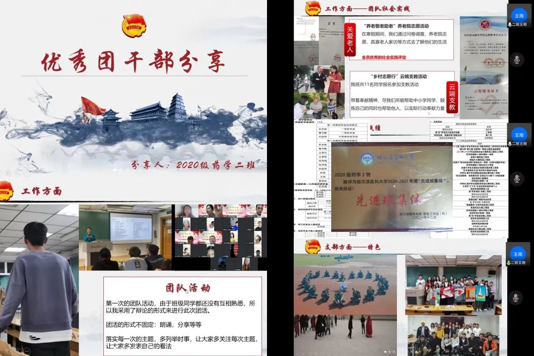 学校2021年度“优秀共青团干部”代表王雨和张闯同学,讲述了他们作为团支书带领团支部同学们积极参与环校接力赛等各项文体活动,开展“养老敬老助老”养老院志愿活动、“云上重走长征路”等各项社会实践活动的优秀事迹。王雨同学分享了她举办团活的经验,相比较于“一人讲,万人听”的单一僵化形式,她采用了辩论赛等更多元的方法,增强同学们的参与感和积极性。张闯同学鼓励同学们让青春在党和人民最需要的地方贡献力量,志存高远,脚踏实地,乘风破浪抵达理想的彼岸!