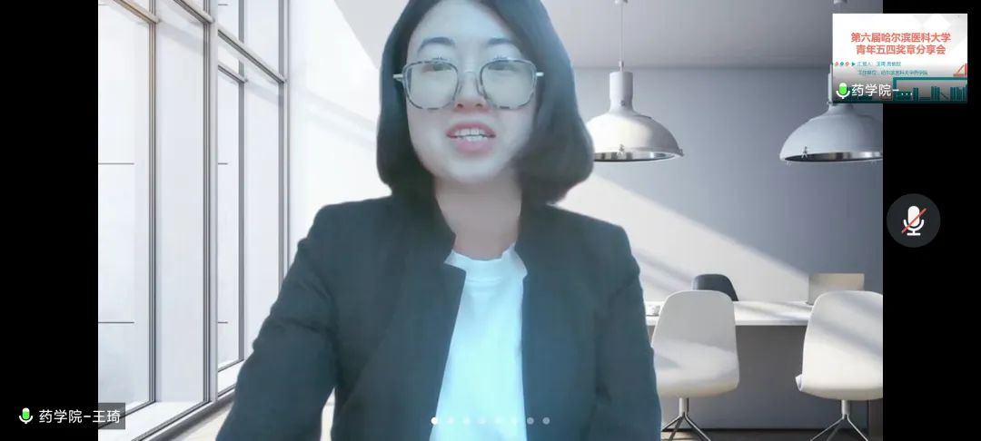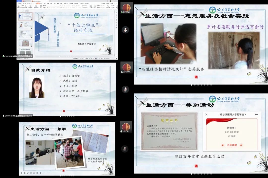 交流会由药学院团总支成员谢靖雯同学主持,院团委书记王琦副教授,本科生王雨、张闯、黄鹤、高鹏娜、白倩倩六名为主讲嘉宾。会上,“校五四青年奖彰”获得者王琦副教授分享了她在本硕博以及教学工作期间的优秀经历,她鼓励同学们在本科期间积极参加挑战杯等竞赛和活动,开拓视野,积累经验,同时也向大家推荐了一些就业企业,缓解了大家在疫情期间对未来迷茫的焦虑感。
