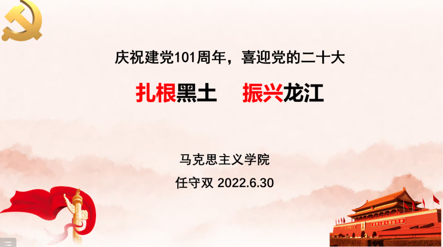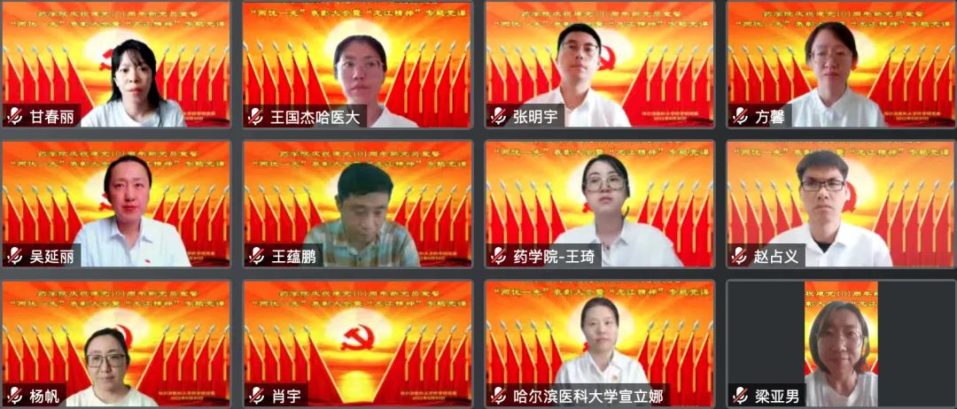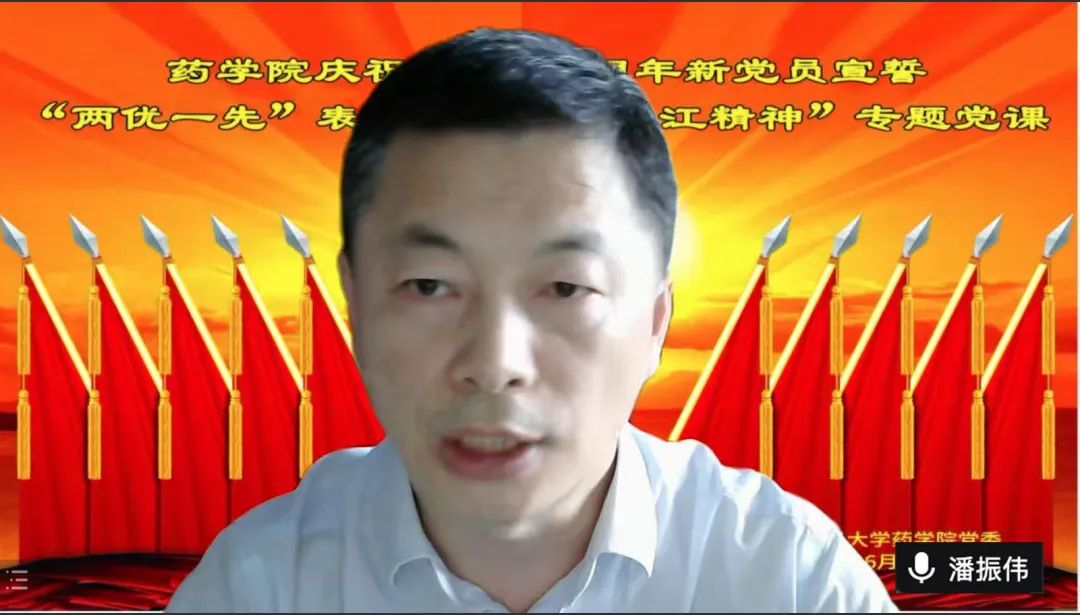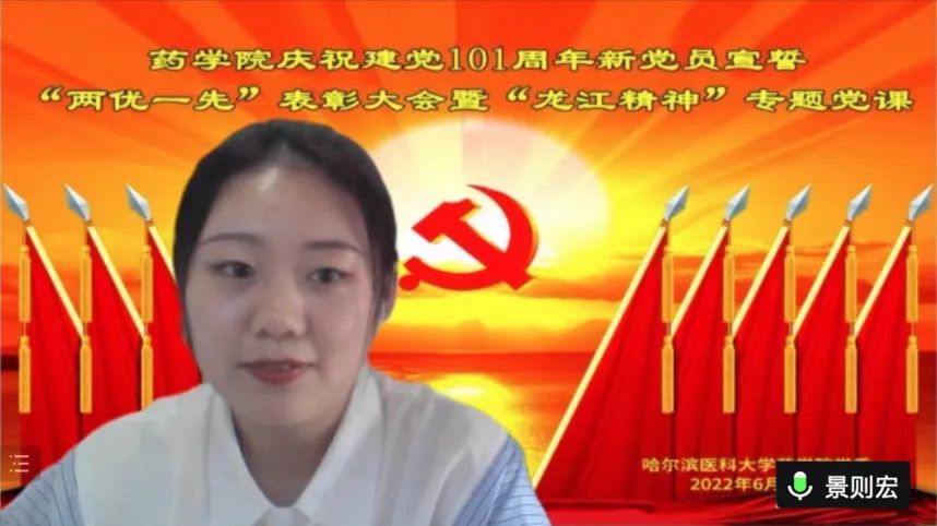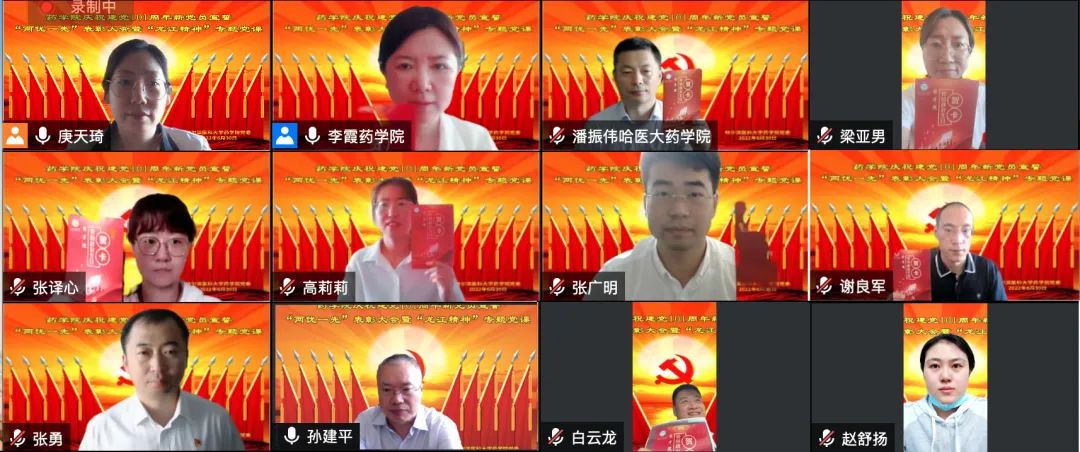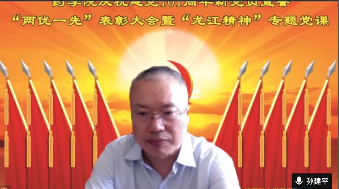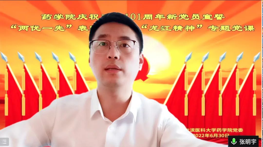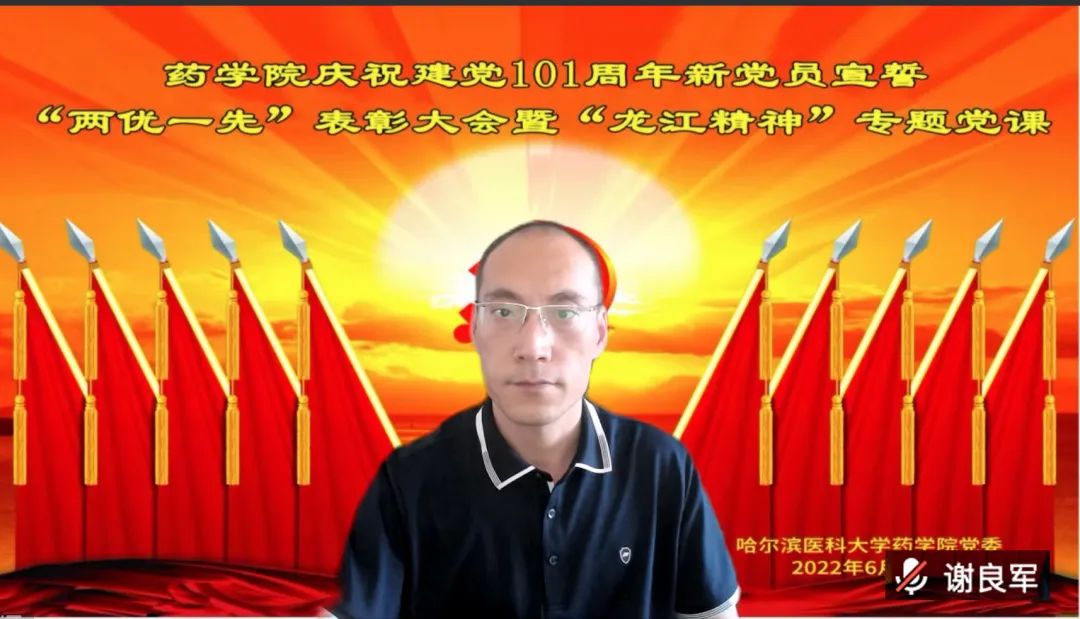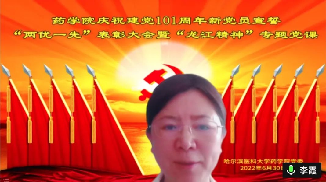 循火红初心,担育人使命。为热烈庆祝中国共产党成立101周年,喜迎党的二十大胜利召开,激励全院师生踔厉奋发、接续奋斗,6月30日下午,药学院在线上举办庆祝建党101周年新党员宣誓、“两优一先”表彰大会暨“龙江精神”专题党课活动。全院党员师生齐聚云端,重温党的光辉历程,为党庆生。学院全体党员参会,马克思主义学院任守双教授受邀主讲“龙江精神”专题党课,党委副书记李霞主持会议。