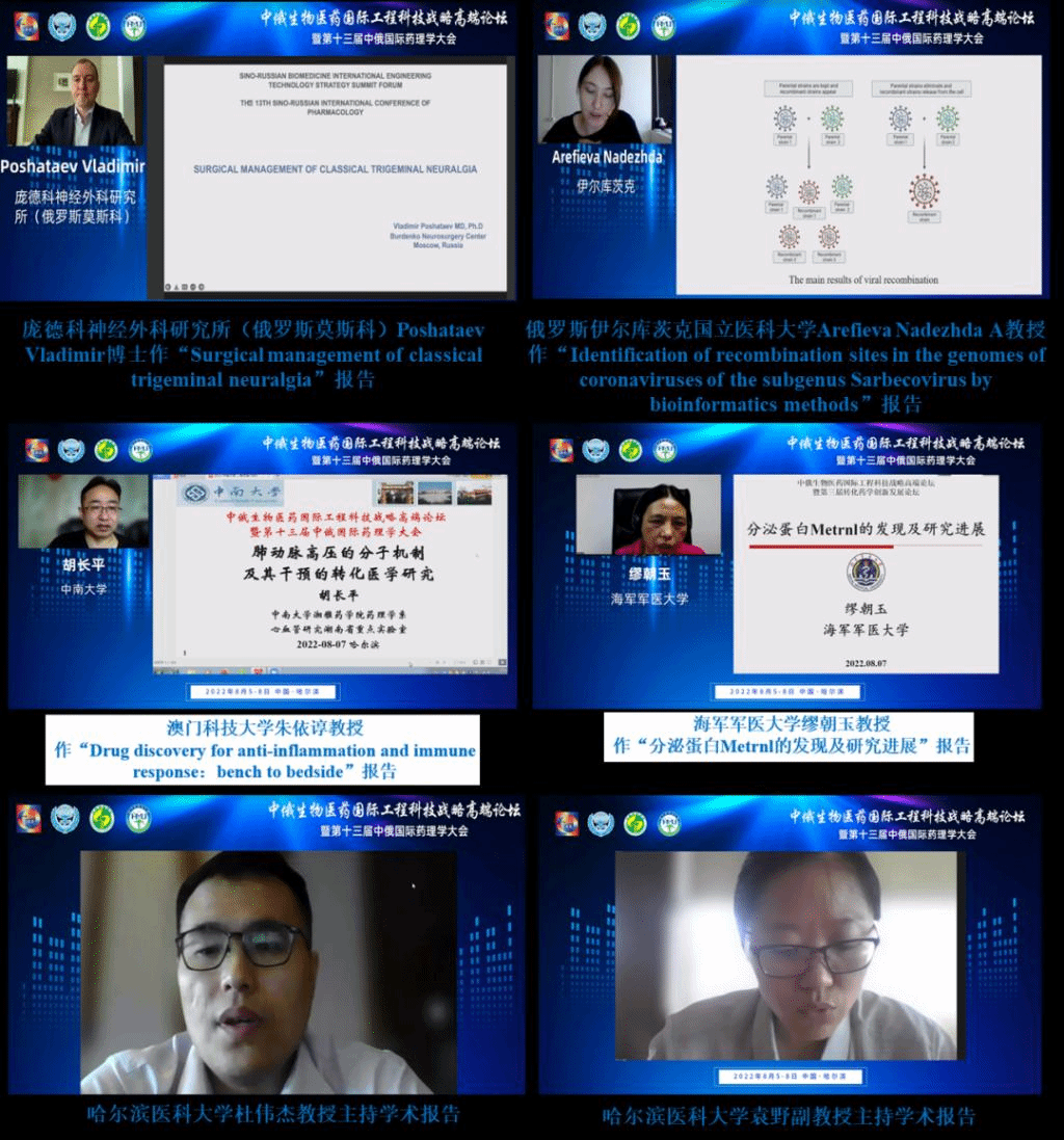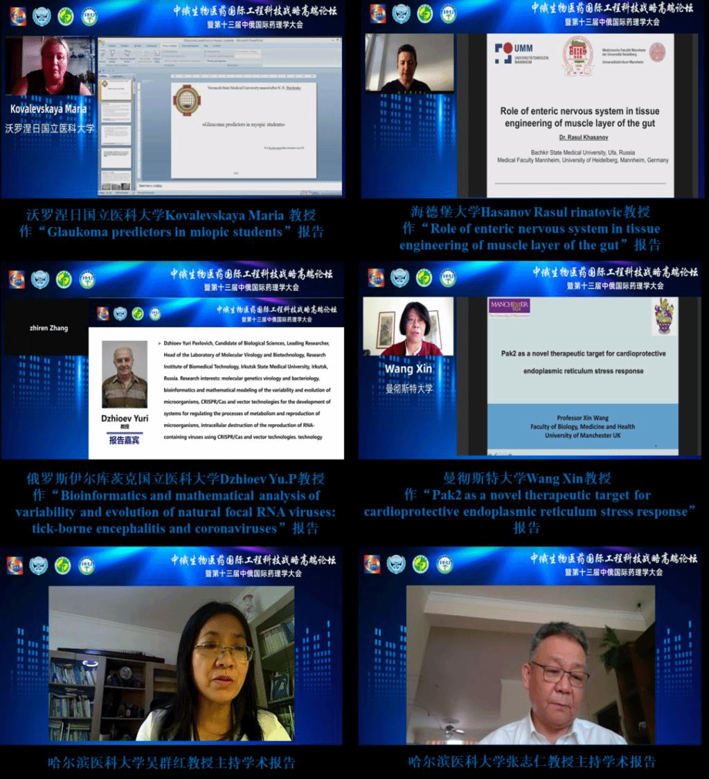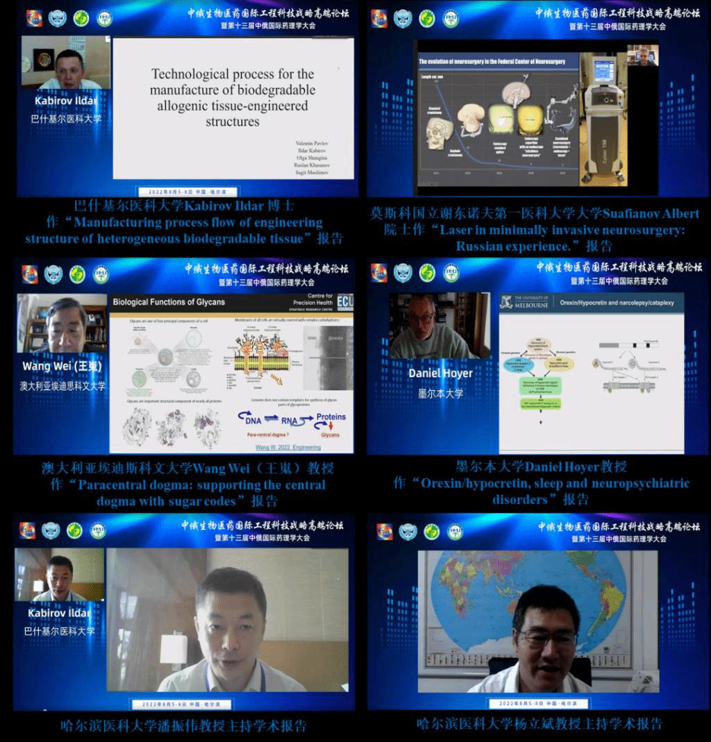 中俄医科大学联盟中方主席杨宝峰院士、中国药理学会党委书记杜冠华教授、俄罗斯沃罗涅日国立医科大学校长Igor Esaylenko院士与会并致辞,大会由黑龙江省药理学会理事长、哈尔滨医科大学副校长许超千教授主持。