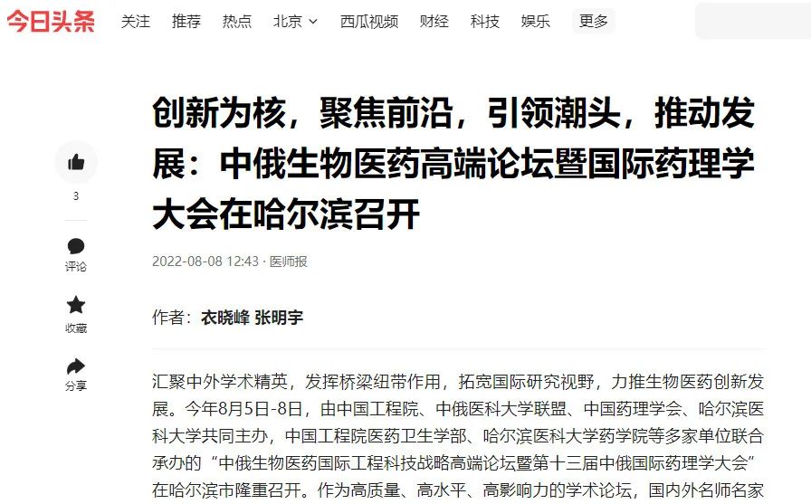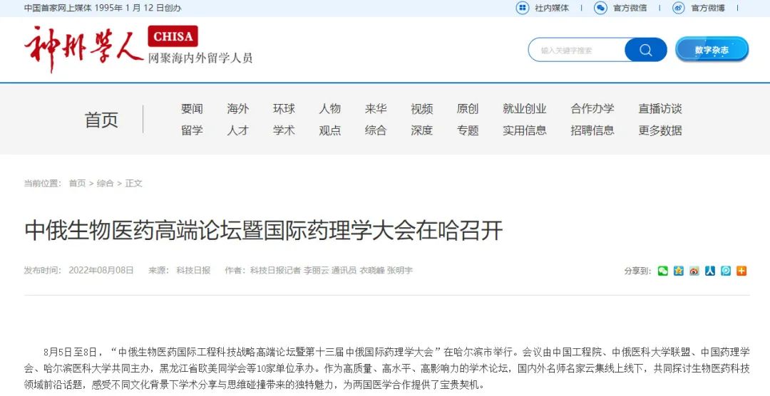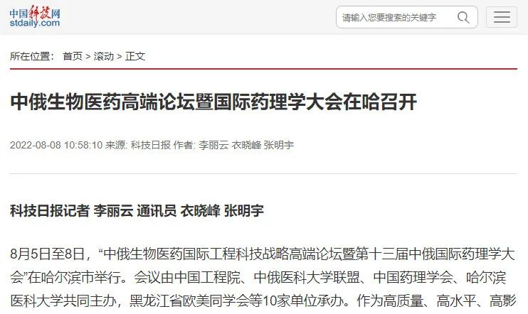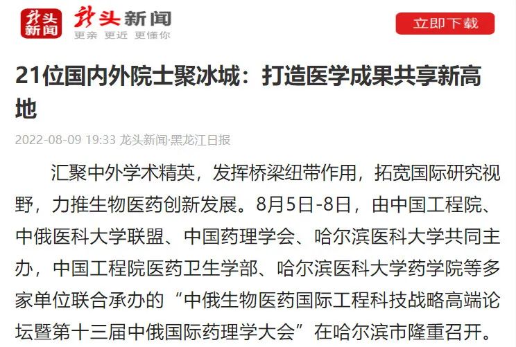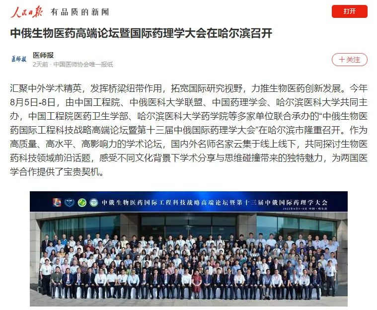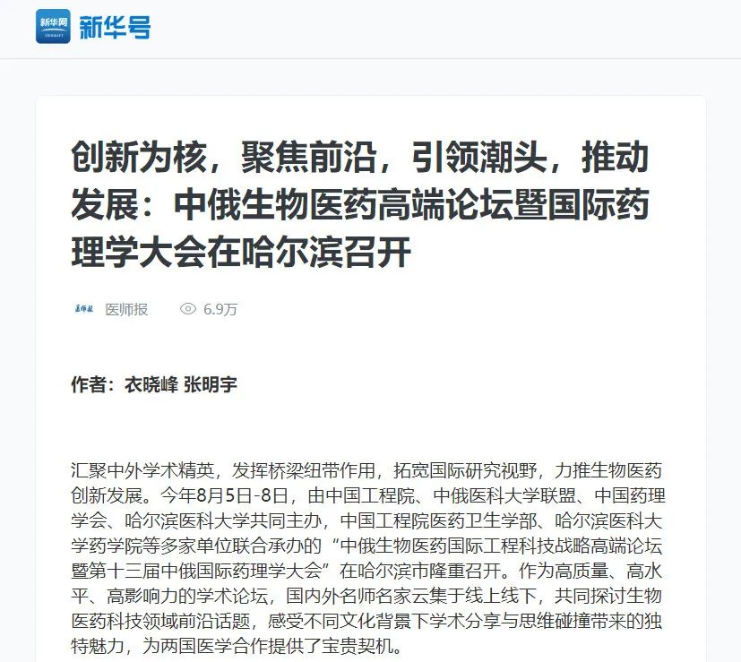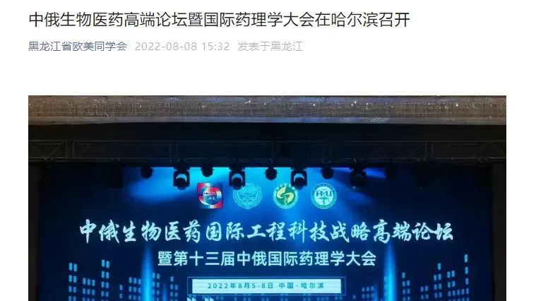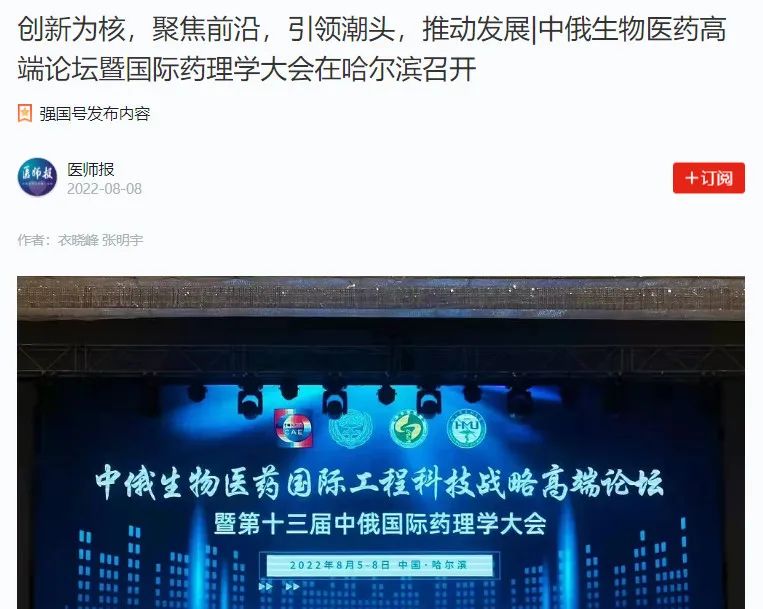为聚焦国际生物医药研究前沿,促进学术名家交流与合作,推动生物医药创新发展,由我院参与举办的“中俄生物医药国际工程科技战略高端论坛暨第十三届中俄国际药理学大会”于8月5日至8日在黑龙江省哈尔滨市隆重召开。