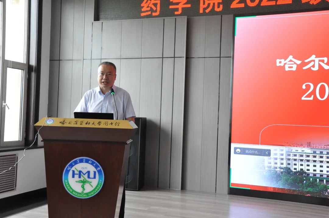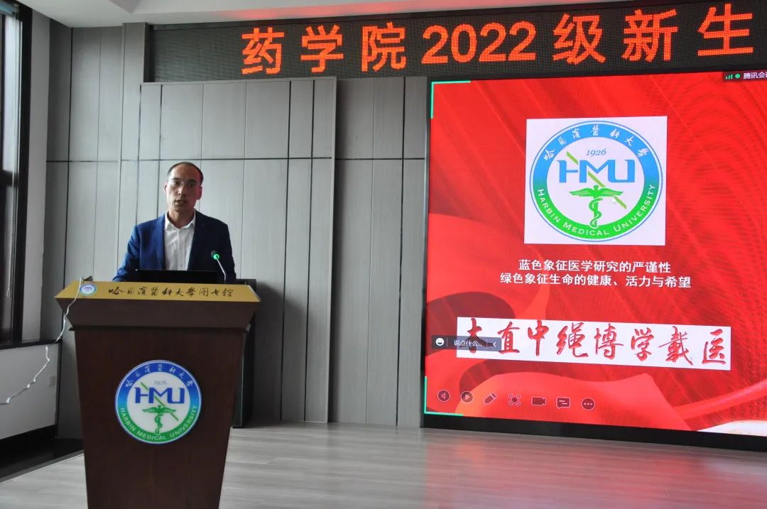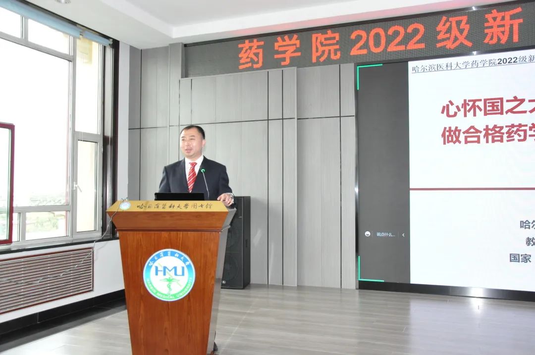 最后,张勇院长以《心怀国之大者 践行初心使命 做合格药学人 实现人生梦想》为题给全体新生上了精彩一课。张勇院长从“为什么来到哈尔滨医科大学药学院实现人生梦想”这一问题引入讲座,逐层递进,深入展开。松花江畔,四季宜人,红墙碧瓦,医者摇篮。哈尔滨医科大学药学院可以帮助每一位药学生成就梦想,恣意翱翔。张勇院长分别从学院概况、历史沿革、国际交流等方面向全体新生展开介绍,他把“拳拳赤子心,殷殷爱校情”传递给每一个新生,他勉励同学们要尊敬师长,全面发展,度过一个充满阳光且有意义的青春时光。开学式在激昂的校歌合唱中圆满结束。