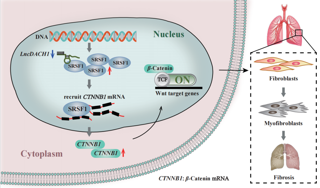 在本项目中,研究者观察到LncDACH1敲除小鼠发生自发性肺纤维化。过表达LncDACH1可显著减轻博莱霉素(BLM)诱导的小鼠肺纤维化,包括炎症浸润、胶原沉积及肺组织重构等病理改变。机制研究表明,LncDACH1通过与SRSF1蛋白结合并降低其表达,抑制SRSF1介导的CTNNB1 mRNA累积,阻止wnt/β-catenin通路激活继而减轻肺纤维化。由于lncRNAs的长度较长,同源性较低,导致许多在动物实验中作用较好的lncRNAs无法转化应用。而本研究发现,LncDACH1的人源保守片段LncDACH1(835-1251)具有与全长序列相似的功能,在人源肺成纤维细胞中亦具有抗纤维化作用。该研究证明LncDACH1可能成为一种新型特发性肺纤维化治疗策略。