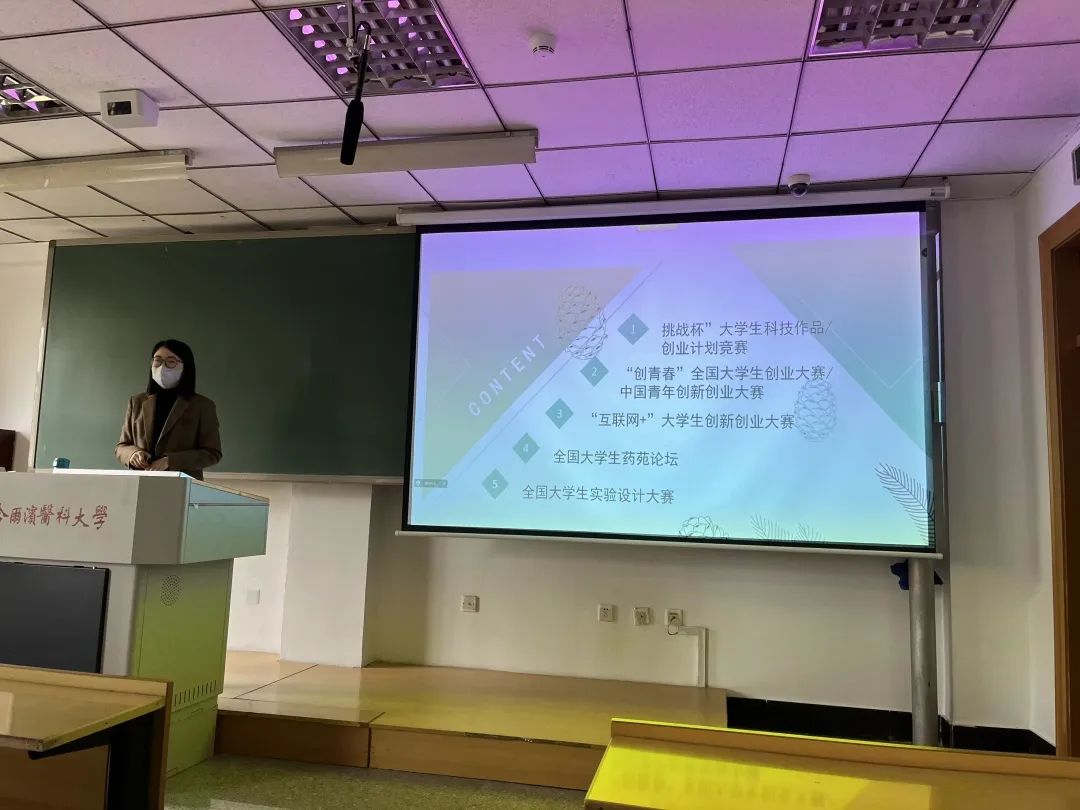 本次讲座由药学院团委书记王琦副教授主讲,为在场师生介绍了“挑战杯”的相关要求和注意事项。讲座从参赛资格及参赛形式、赛事流程、作品申报及要求和奖励政策四个方面让大家对大学生创新创业大赛有了一个基础全面的了解,同时也让大家对各大不同比赛的着重点有了一个明确的区分,准备参赛的师生在努力方向和赛道选择上都受益颇多。