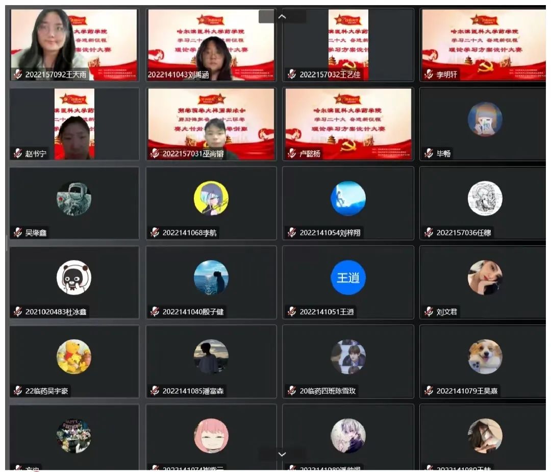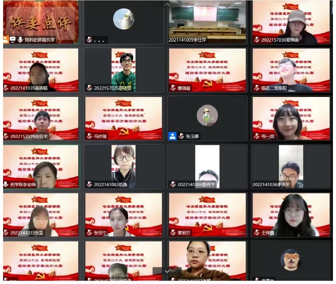 滔滔黄河水,巍巍昆仑山,壮美山河谱新篇。为深入贯彻学习党的二十大精神,引导全院学生牢记初心使命,吹响奋进号角, 11月27日下午,药学院举办了“学习二十大,奋进新征程”理论学习方案设计大赛,本次活动以分组比赛、线上评审观赛的形式进行,药学院党委副书记李霞、副院长兼机关党支部书记谢良军、副处级辅导员兼学生党总支书记姜大巍、研究生党总支书记毕海荣、药化联合党支部书记甘春丽、药理党支部宣委杨帆担任评委,全体辅导员、研究生以及2022级,2021级本科生近300名师生线上观看了本次活动。