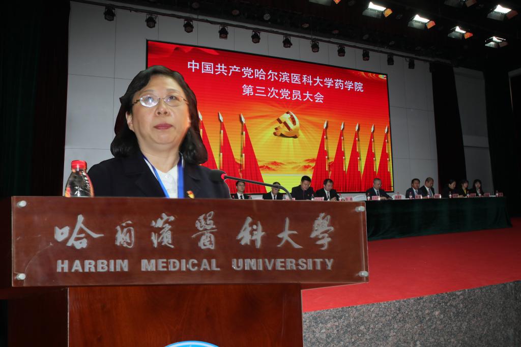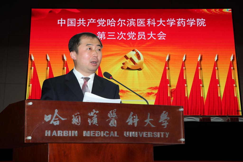 在热烈的掌声中,孙建平同志代表中共哈医大药学院第二届委员会,向大会作了题为《凝心聚力谋发展 砥砺奋进谱新篇--创建国内一流、国际有影响的药学院》的报告。