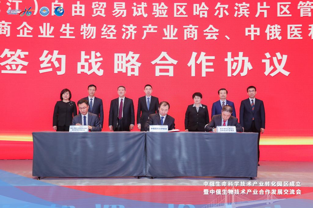 现场授牌仪式后,中俄医科大学联盟、中国黑龙江自由贸易区哈尔滨片区管理委员会、哈尔滨市工商企业联合会举办了首届“中俄生物技术产业合作发展交流会”,产业转化园区将依托中俄医科大学联盟、哈尔滨工商企业生物经济产业商会,促进中俄生命科学交流与合作,组建中俄两国人民的国际高端医疗服务中心。现场还举行了战略合作签约仪式及相关交流推介活动,哈尔滨医科大学药学院院长张勇教授参加了战略合作仪式签约。