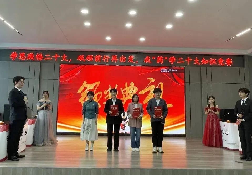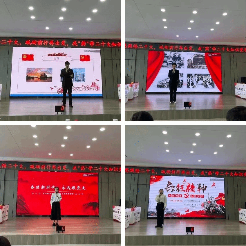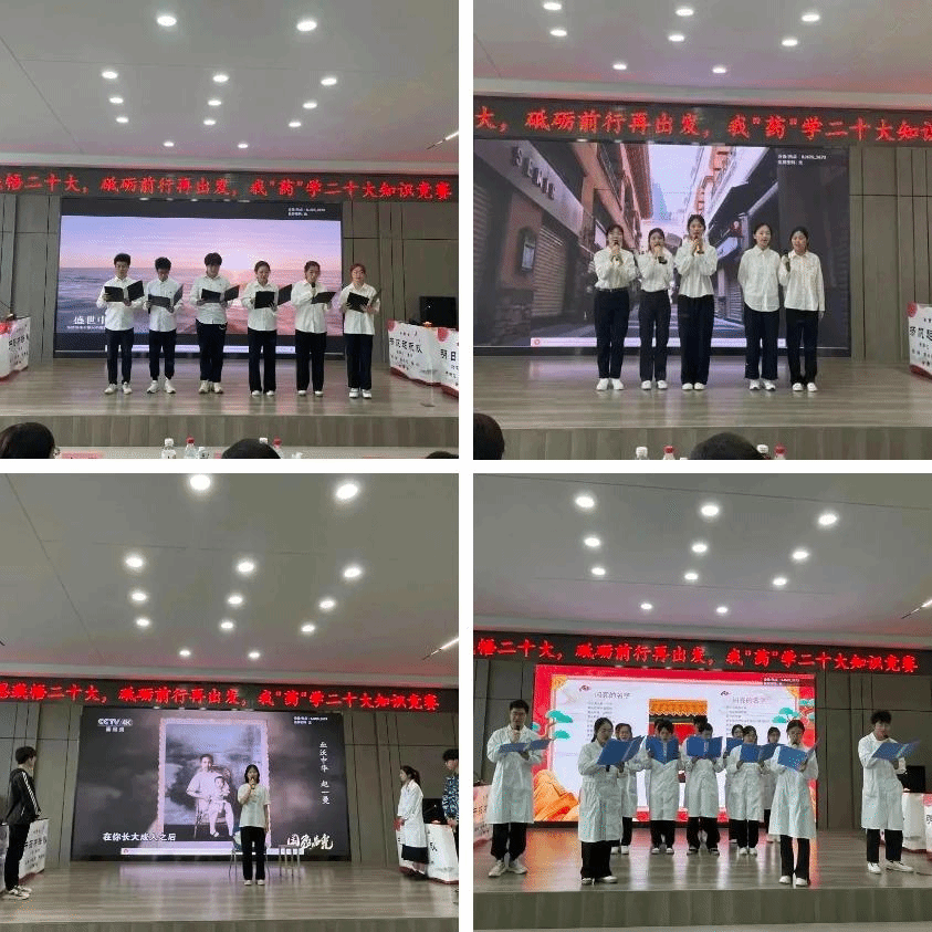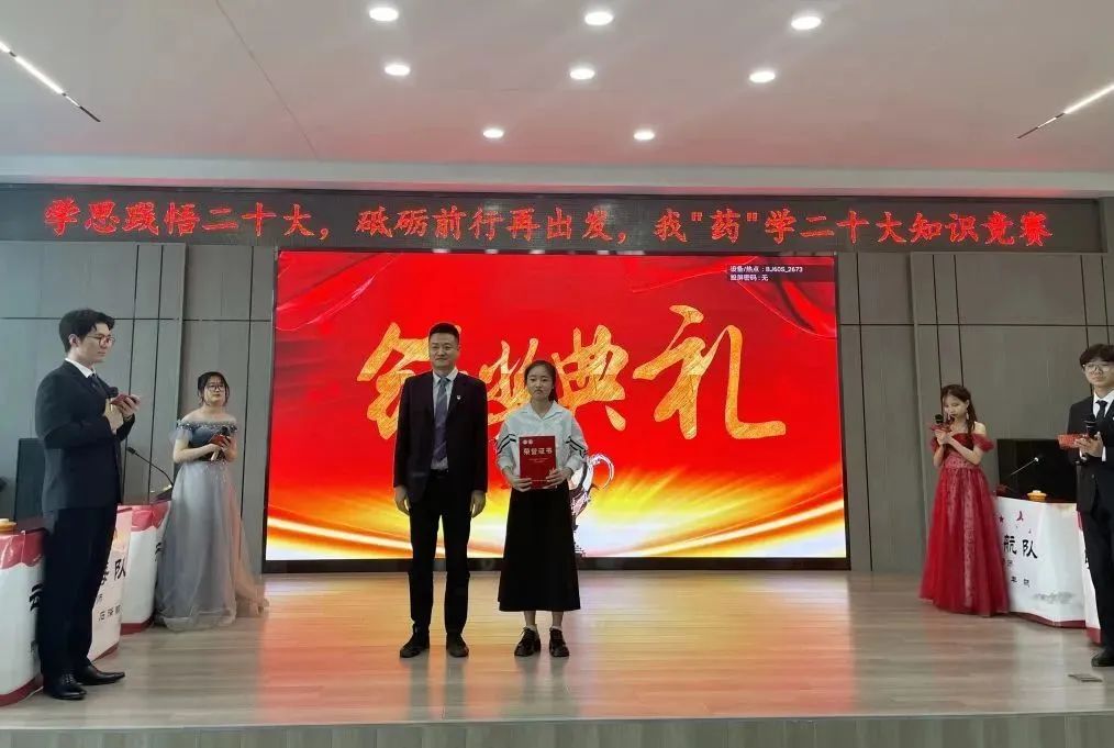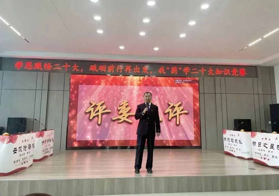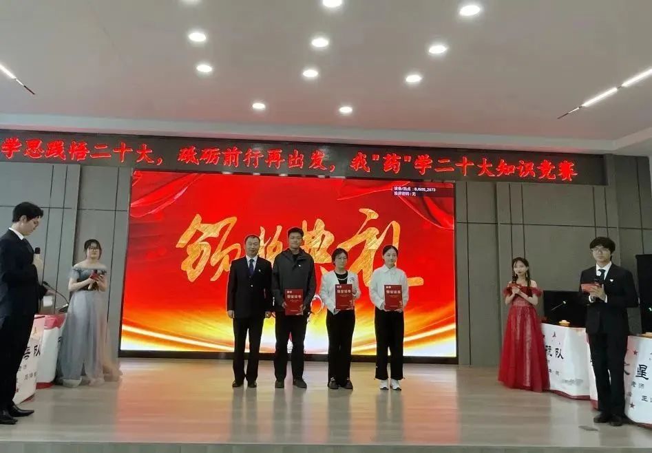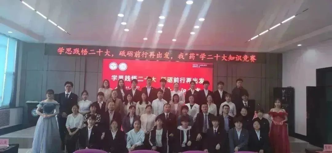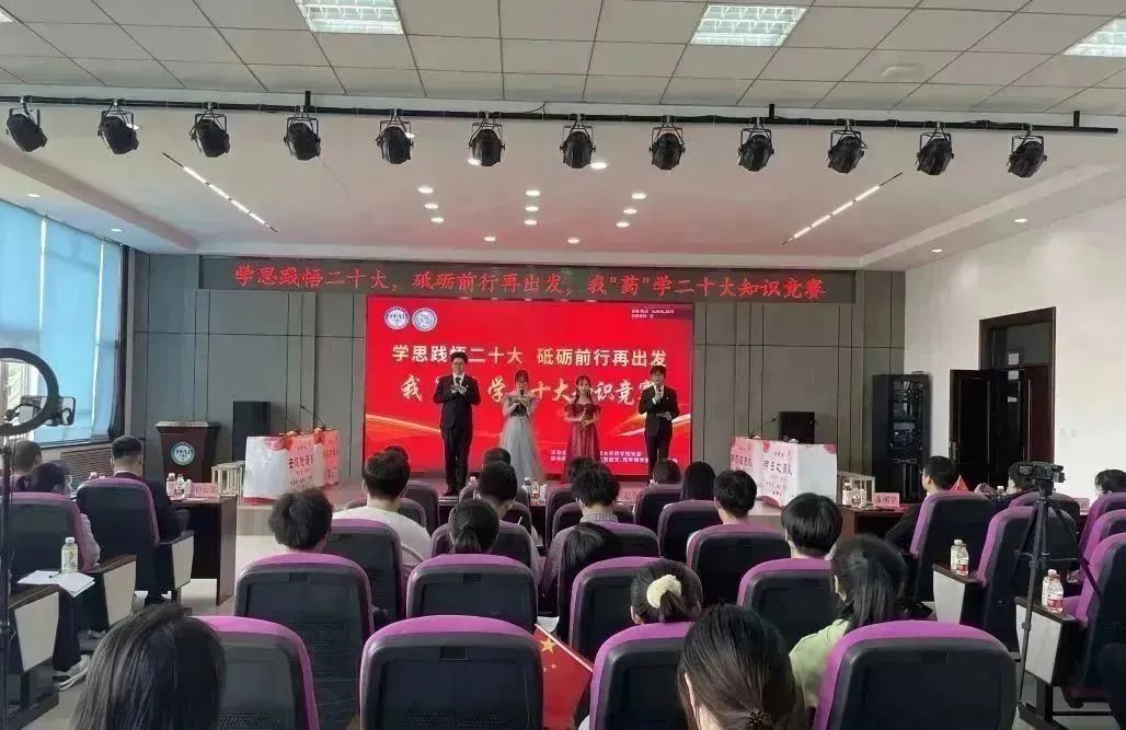 生逢其时,奋斗其时。为深入开展习近平新时代中国特色社会主义思想主题教育,贯彻落实党的二十大精神,5月13日下午,药学院党委在学校星联学术报告厅举办“学思践悟二十大,砥砺前行再出发”我“药”学二十大知识竞赛。药学院院长张勇、校党委宣传部副部长王晓云、校党委学生工作部副部长赵春辉、药学院党委副书记李霞、药学院副院长白云龙、药学院副处级辅导员兼学生党总支书记姜大巍以及各职工党支部书记担任大赛评委。全体辅导员、兼职班主任、研究生和本科生学生代表近300余人现场参会,其他师生通过腾讯会议线上同步收看直播。比赛由学生党总支、学生理论中心组承办。