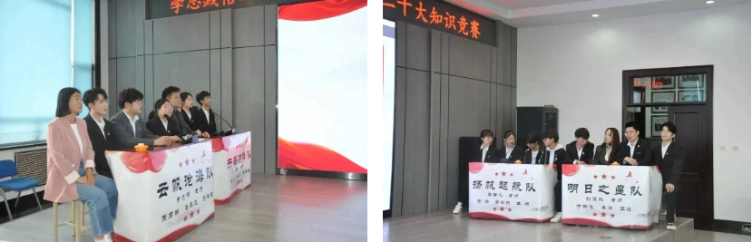 在决赛中,每个队伍的演讲人激情澎湃,饱含对党的敬仰与深情。他们讴歌党的丰功伟绩,展现青年学生的使命担当;他们表达着对祖国的赤城热爱,坚定了跟党走的不移信念。在激动人心的答题环节,四组队伍分别选出一位教师、一名研究生和两位本科生参与比赛,在“谁与争锋”、“激流勇进”、“扭转乾坤”,三个答题环节中,比拼紧张激烈,选手积极拼手速、拼脑力,沉着冷静、认真作答,充分展现了学院师生扎实的政治理论功底。现场的观众抽奖环节增加活动的趣味性和参与感。表演环节中,四组选手用朗诵、唱歌、舞台剧等多种表演形式呈现的精彩节目使党的二十大精神生动形象化,形式多样化,喜闻乐见化,提升了理论学习的多元化和引领力。才艺展示后,文艺部的同学上台领唱《我和我的祖国》,全体师生起立挥舞红旗齐声合唱,将本次知识竞赛气氛推向高潮。