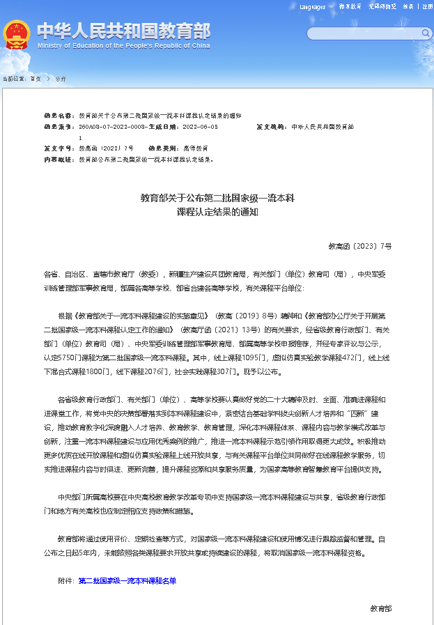 近日,教育部公布了第二批国家级一流本科课程认定名单,我院杨宝峰院士建设的《药理学》课程被认定为第二批国家线上线下混合式一流课程。在2020年,《药理学》课程被认定为首批国家线上一流课程,该课程再次入选国家级一流本科课程,是在原有一流课程建设基础上取得的新突破,是学院积极响应教育部“双万计划”的战略部署的新硕果。