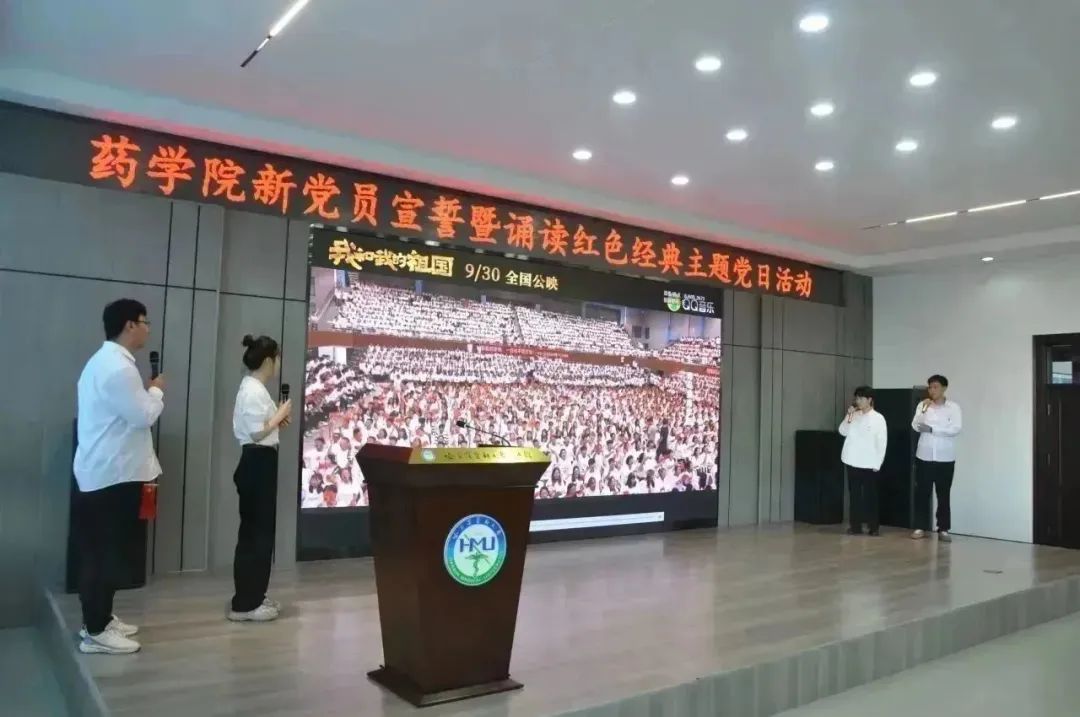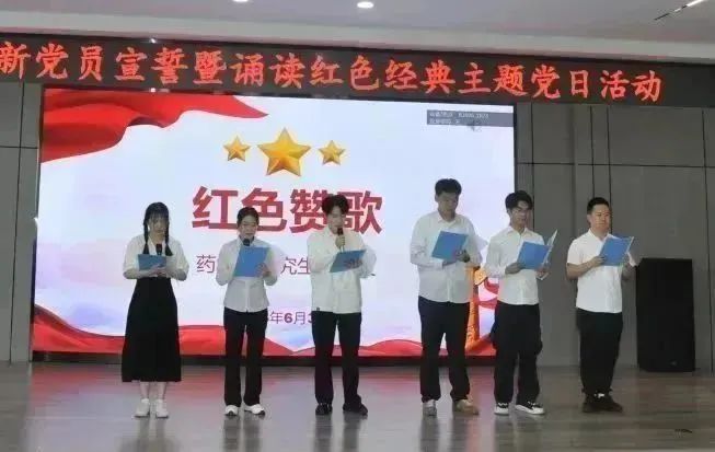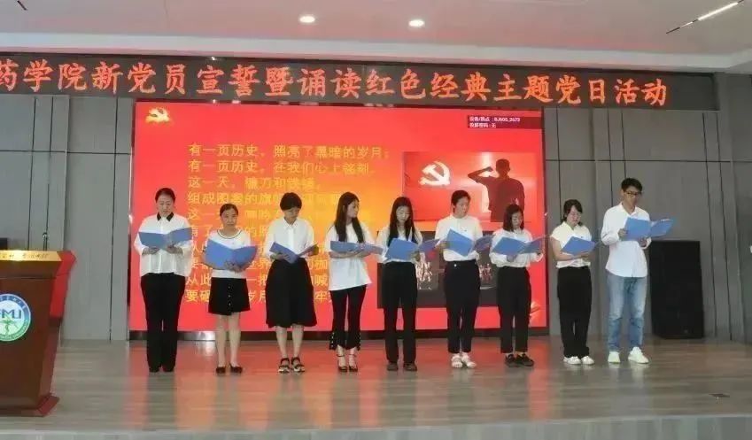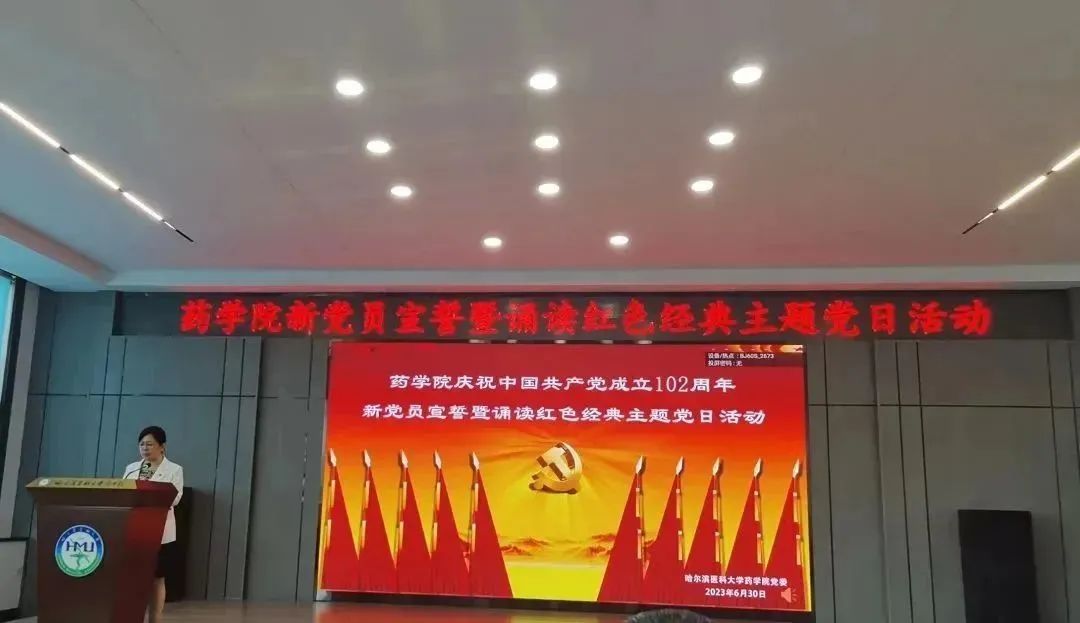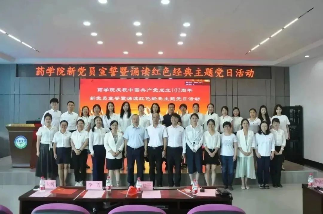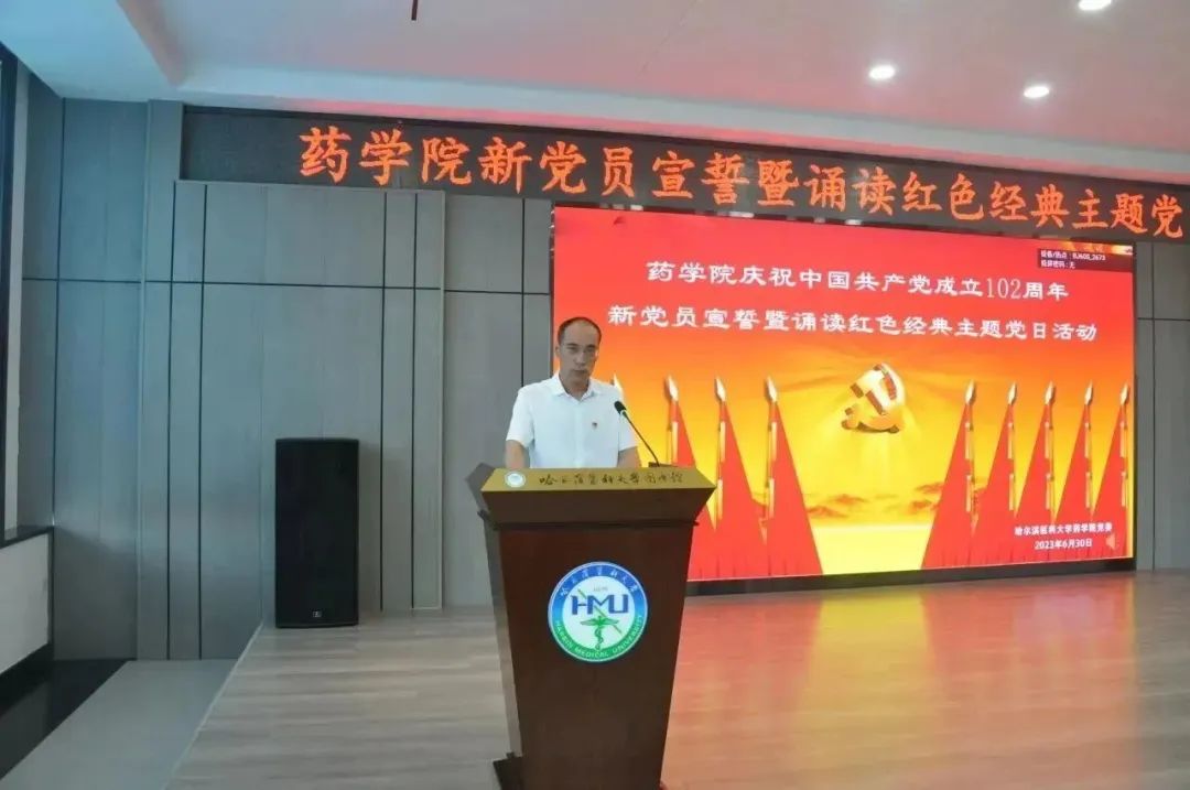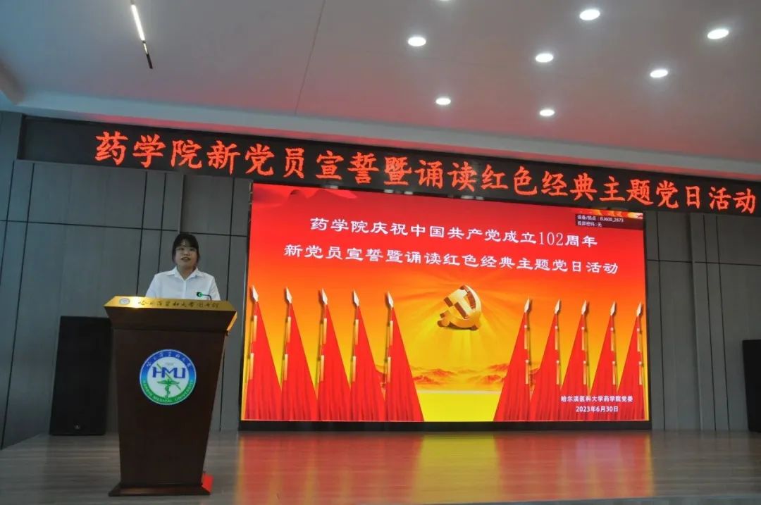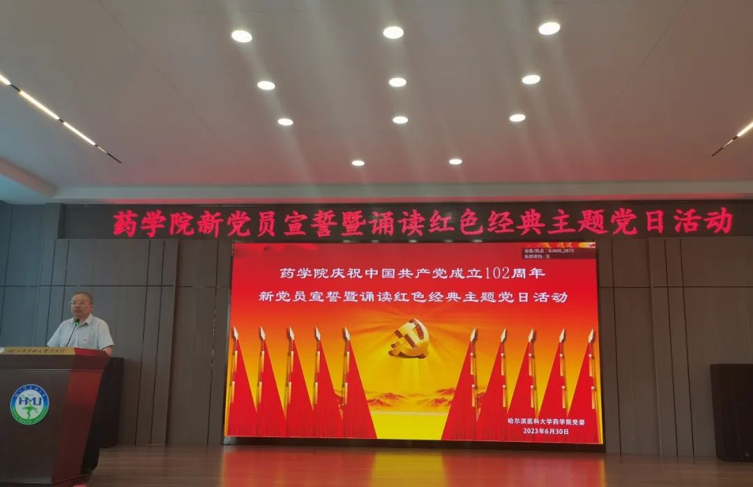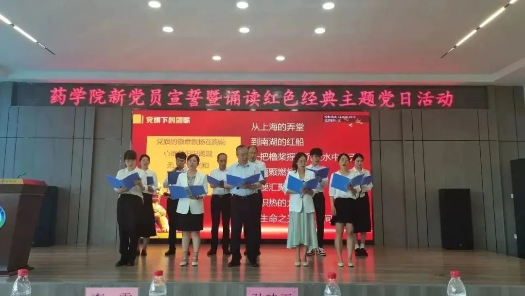 追寻红色足迹,勇担育人使命。为热烈庆祝中国共产党成立102周年,贯彻落实习近平新时代中国特色社会主义思想主题教育工作走深走实,激励全院师生踔厉奋发、勇毅奋斗,6月30日下午,药学院在校星联学术报告厅举办庆祝中国共产党成立102周年新党员宣誓暨诵读红色经典主题党日活动。药学院全体党员师生齐聚活动现场,重温入党誓词,讴歌党的光辉历程,共同为党庆生。学院党委书记孙建平、副书记李霞、副院长谢良军、副处级辅导员兼学生党总支书记姜大巍出席本次活动,活动由李霞副书记主持。